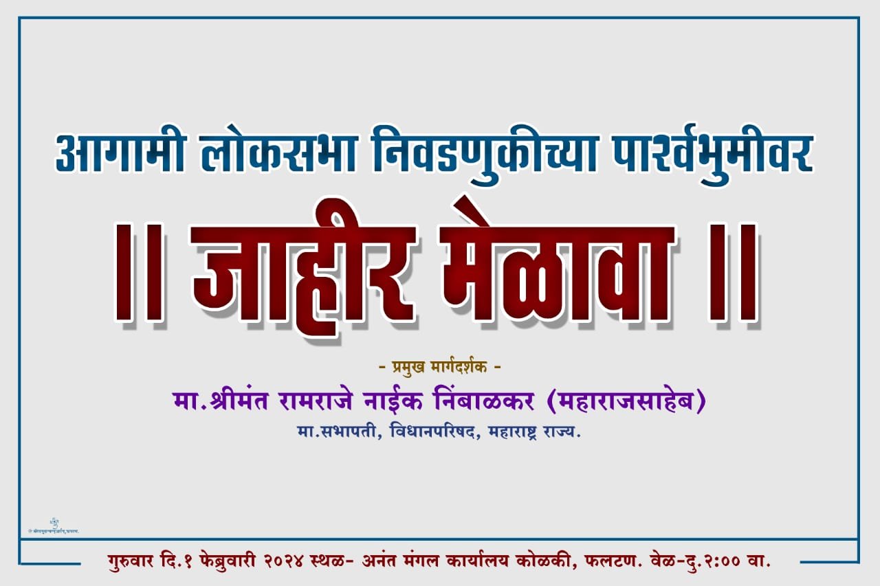 महाराष्ट्र विधान परिषदेचे माजी सभापती तथा विद्यमान विधान परिषद सदस्य आमदार श्रीमंत रामराजे नाईक निंबाळकर यांच्या प्रमुख मार्गदर्शनाखाली फलटण येथे गुरुवार दिनांक १ फेब्रुवारी २०२४ रोजी आगामी लोकसभा निवडणुकीच्या पार्श्वभूमीवर जाहीर मेळाव्याचे आयोजन करण्यात आले आहे. मात्र या मेळाव्या प्रसंगी सोशल मीडिया वर प्रसिद्ध केलेल्या बॅनर वरती कोणत्याही पक्षाच्या नावाला अथवा कोणत्याही पक्षाच्या नेत्याच्या फोटोला बगल देण्यात आली असल्याने राष्ट्रवादीच्या ( अजित पवार गट ) गोटात खळबळ माजली असल्याचे बोलले जात आहे.