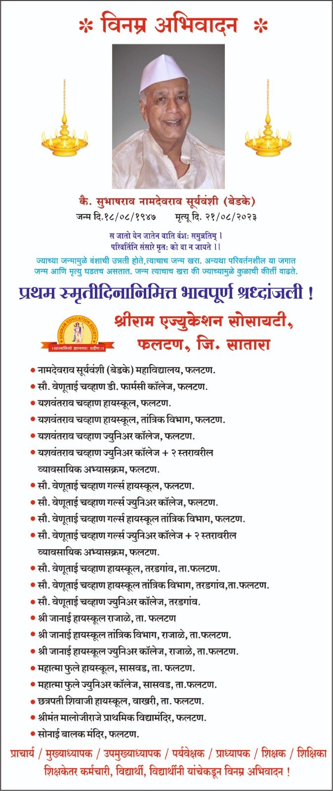समाजाच्या प्रत्येक क्षेत्रात विशेष करून शिक्षण क्षेत्रात सातत्याने अलौकिक कार्य केलेल्या सुभाष काकांना आपल्या मधून जाऊन आज एक वर्ष झाले आहे लौकीक अर्थाने ते आपल्यातून गेले असले तरी त्यांनी केलेल्या शैक्षणिक क्षेत्रातील कार्यामुळे ते अनंत काळापर्यंत आपल्या सोबत राहणार आहेत कै. काकांच्या पश्चात त्यांच्या सुविध्य पत्नी सविता काकी यांनी श्रीराम एज्युकेशन सोसायटीच्या अध्यक्षपदाचा भार स्वीकारून एक प्रकारे काकांना व त्यांनी केलेल्या असामान्य कार्याला भावपूर्ण श्रद्धांजली च वाहिली आहे.