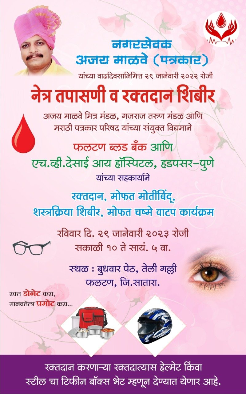अजय माळवे यांच्या वाढदिवसानिमित्त अजय माळवे मिञमंङळ, गजराज तरुण मंङळ, मराठी पञकार परिषदेच्या संयुक्त विद्दमाने आणि फलटण ब्लङ बॕंक, एन. व्ही. देसाई आय हॉस्पिटल हडपसर पुणे यांच्या सहकार्याने रविवार दिनांक २९ जानेवारी रोजी तेली गल्ली बुधवार पेठ येथे सकाळी १० ते सायंकाळी ५ वाजेपर्यंत रक्तदान शिबीर, नेञतपासणी, मोफत मोतीबिंदू, शस्त्रक्रिया शिबीर, मोफत चष्मे वाटप कार्यक्रम आयोजित करण्यात आला आहे. तसेच वृक्षारोपन, महात्मा शिक्षण संस्थेच्या मुकबधीर विद्यालयातील विद्यार्थ्यांना मिष्टान्न, वृद्धाश्रमात फळे वाटप करण्यात येणार असून अजय माळवे हे आपल्या तेली गल्ली बुधवार पेठ येथील निवासस्थानी शुभेच्छा स्विकारणार आहेत. अशी माहिती तात्या तेली यांनी दिली.