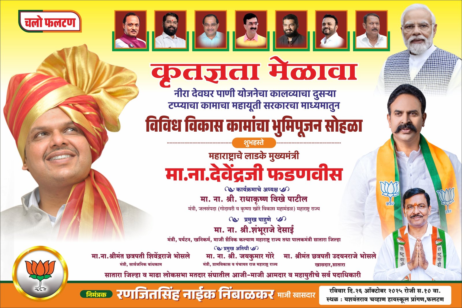 मुख्यमंत्री ना. देवेंद्र फडवणीस यांच्या हस्ते फलटण शहर आणि तालुक्यातील शेकडो कोटींच्या विविध विकास कामांचे लोकार्पण , उदघाटन आणि भूमीपुजन समारंभाचे आयोजन रविवार दि. २६ ऑक्टोबर२०२५ रोजी सकाळी ९ वाजता करण्यात आले असल्याची माहीती मा. खासदार रणजित सिंह नाईक निंबाळकर यांनी दिली . यावेळी फलटण नगरपालिका आणि जिल्हा परिषद पंचायत समितीच्या निवडणुका च्या पार्श्वभूमीवर भव्य सभेचे आयोजन सुद्धा करण्यात आले आहे.