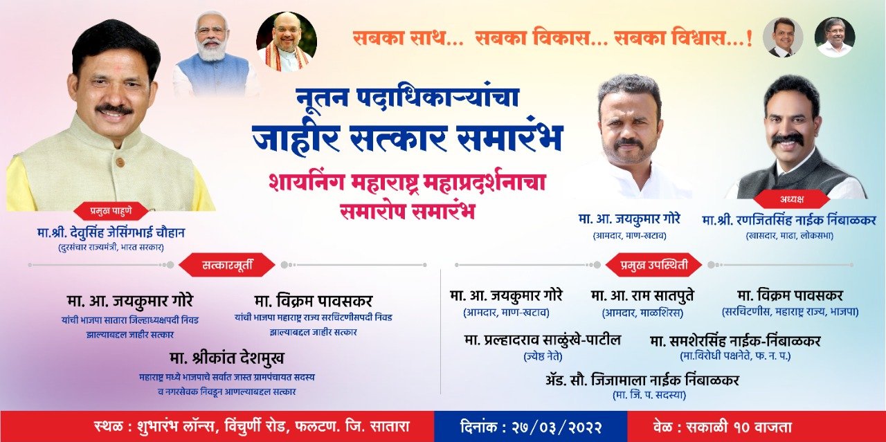 याप्रसंगी आमदार जयकुमार गोरे यांची भाजपच्या सातारा जिल्हा अध्यक्षपदी व विक्रम पावसकर यांची राज्य सरचिटणीस पदी निवड झाल्याबद्दल, तसेच राज्यात भाजपाचे सर्वात जास्त ग्रामपंचायत सदस्य व नगरसेवक निवडून आल्याबद्दल सोलापूर जिल्हाध्यक्ष श्रीकांत देशमुख या सर्वांचा सत्कार केंद्रीय राज्यमंत्री यांच्या हस्ते होणार आहे. या कार्यक्रमाला नागरिकांनी उपस्थित रहावे असे आवाहन संयोजकांच्या वतीने करण्यात आले आहे.